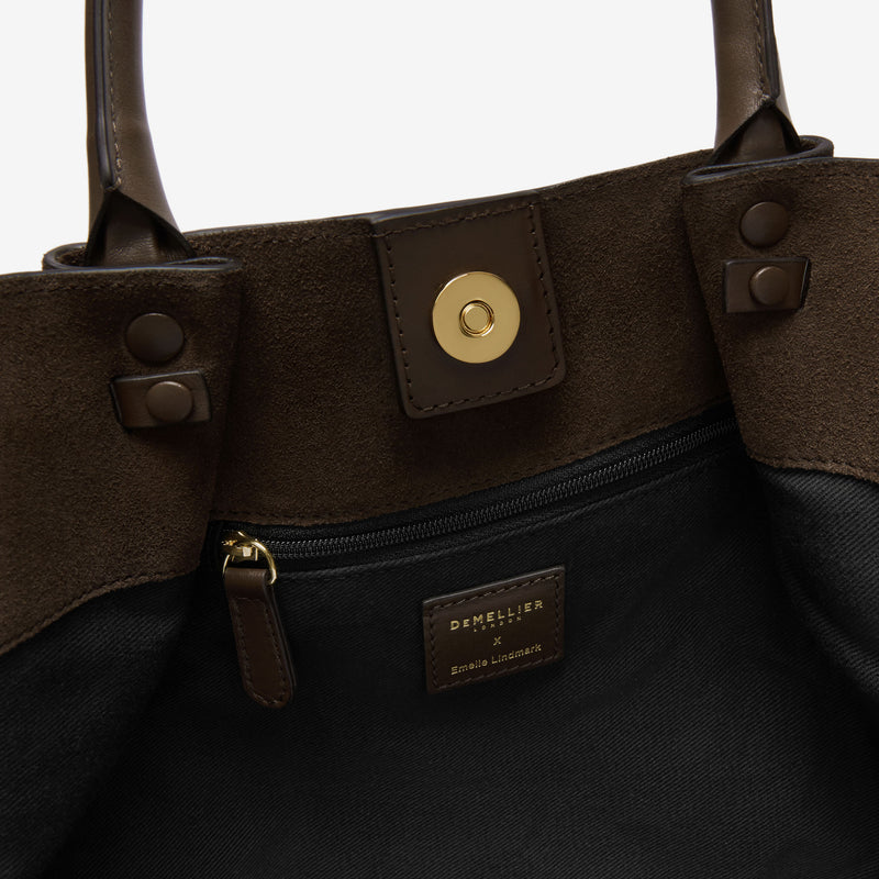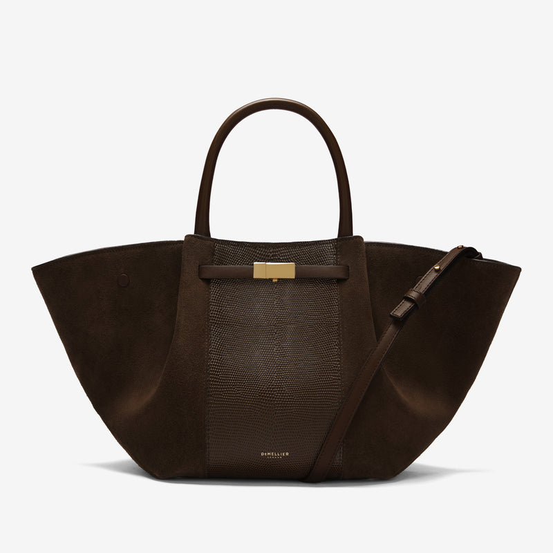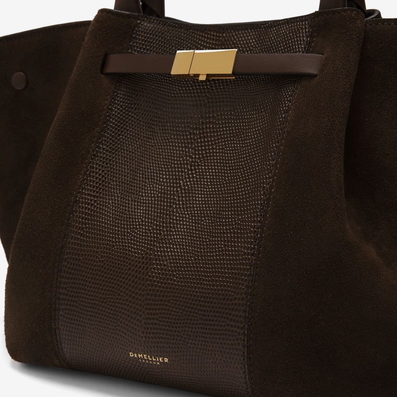 Emelie Lindmark interpretiert The Midi New York in exklusivem Mokkafarbenem Veloursleder mit Eidechsenprägung neu.