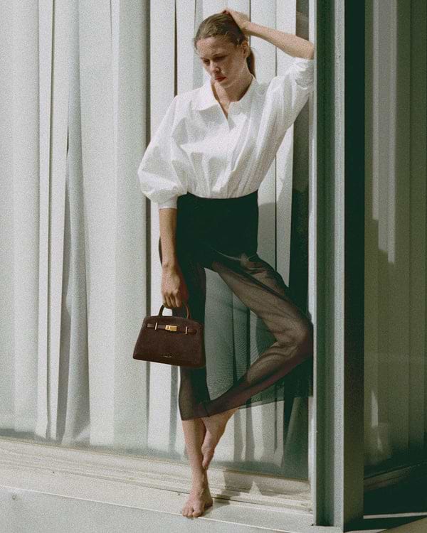 Interior: Un compartimento principal espacioso, forrado en algodón reciclado y asegurado con una cremallera metálica con tirador inspirado en un lazo. Un bolsillo interior con cremallera, realzado por un logo DeMellier en relieve sobre cuero, acomoda una cartera pequeña y otros esenciales.