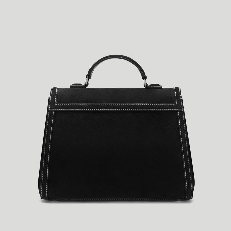 Esterno: silhouette ispirata a un baule, realizzata in pregiato suede nero con cuciture ecrù precise, impreziosita dalla chiusura The Paris, manico superiore arrotondato (da portare a mano) e finiture bombee su misura. Anelli a D con cerniera placcati in argento, tracolla regolabile e removibile da portare a tracolla e piedini alla base.