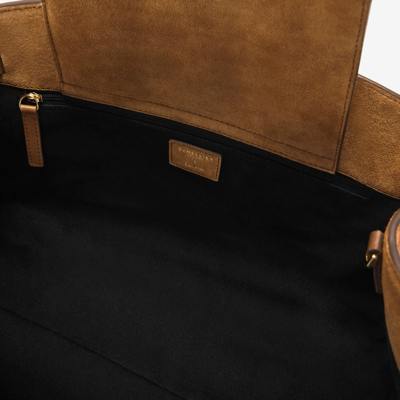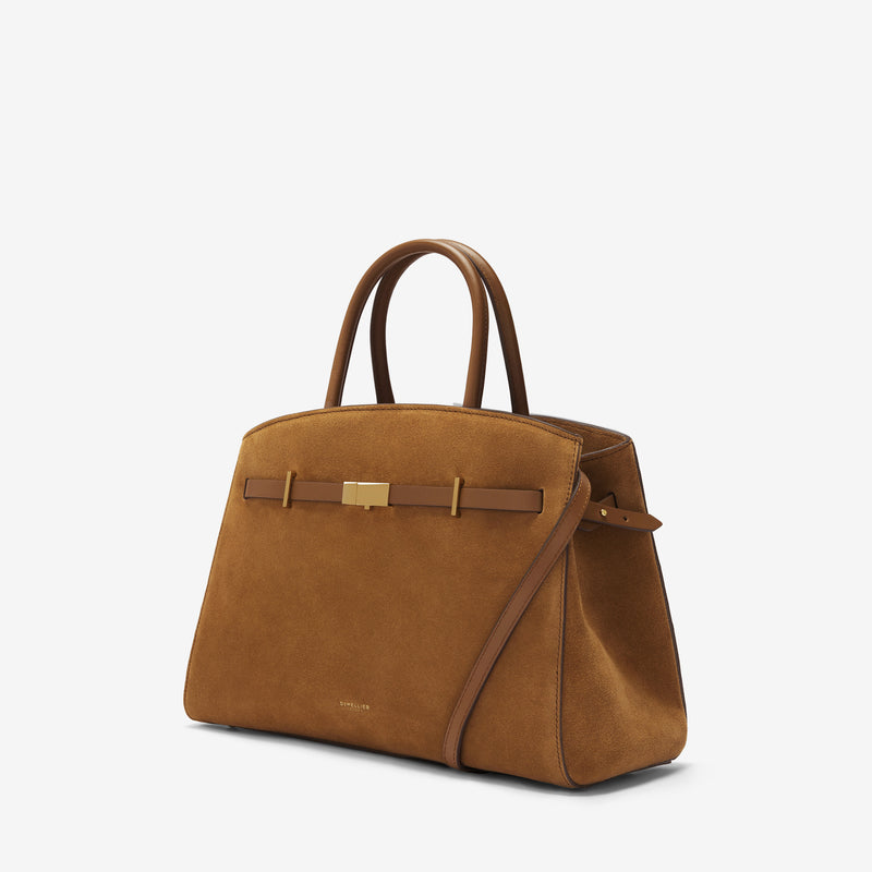 Exterior: External slip pocket, top handle (to be held by hand or on the crook of the arm), detachable adjustable strap, bespoke D-rings, DeMellier mini Sam Browns, Hudson adjustable belt, gold-plated Hudson bridges and lock, foil embossed DeMellier logo, base feet.