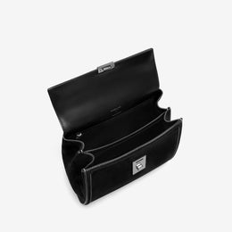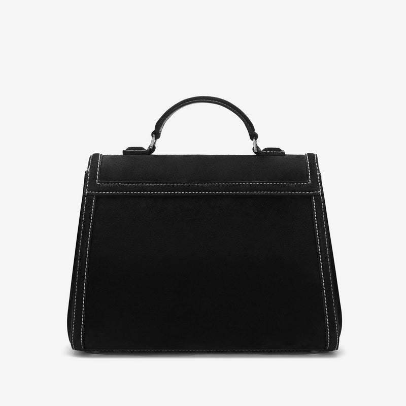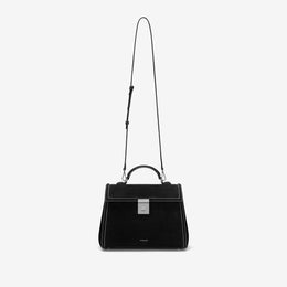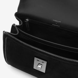 Exterior: Trunk-inspired shape crafted in rich Black Suede with precise Ecru stitching, adorned with the Paris lock, rounded top handle (to be held by hand) and custom bombee trim framing. Silver-plated hinging D-rings, removable adjustable crossbody strap and base feet.