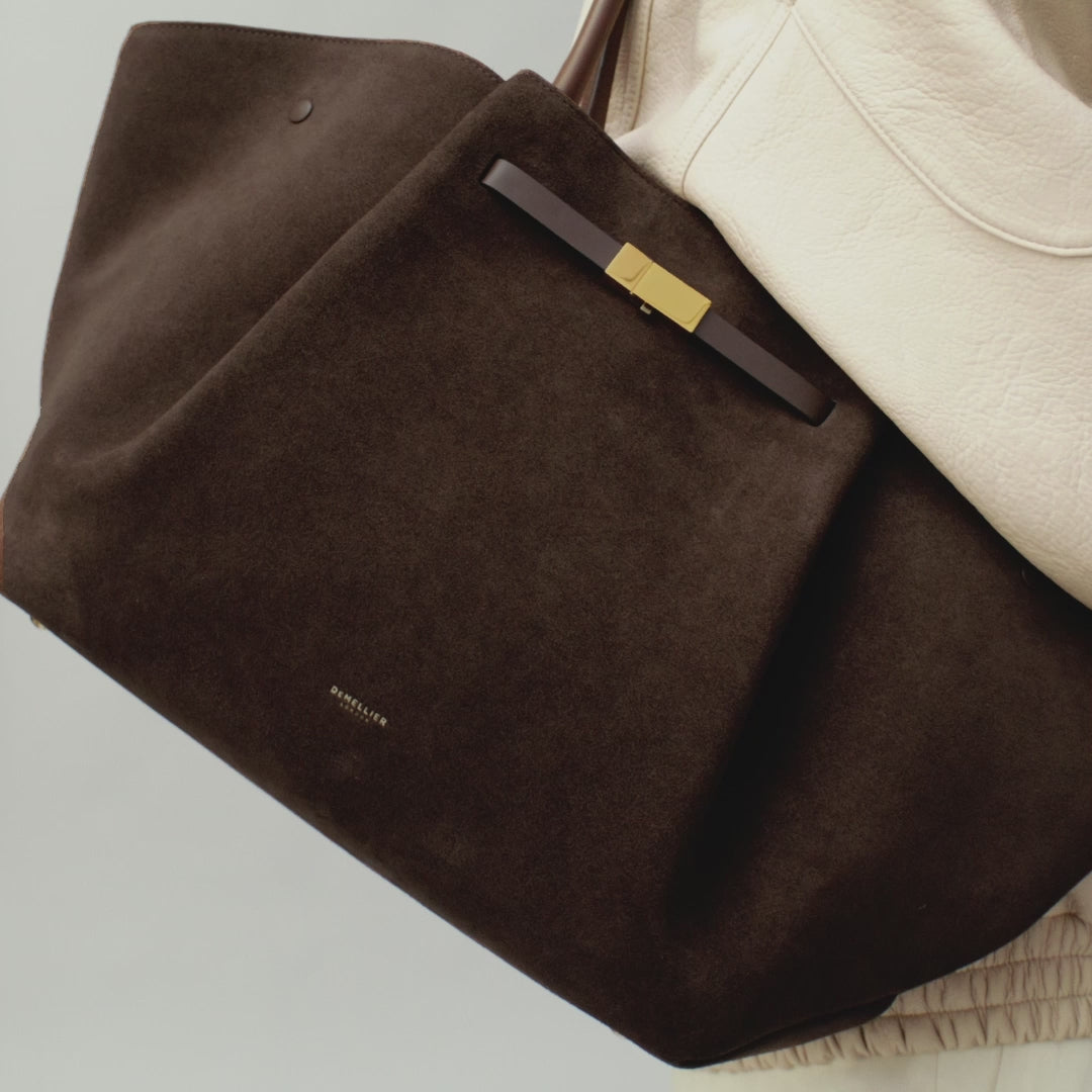 Exterior: Double top handles, metal feet, unique triangular fold design, foil embossed DeMellier logo.
